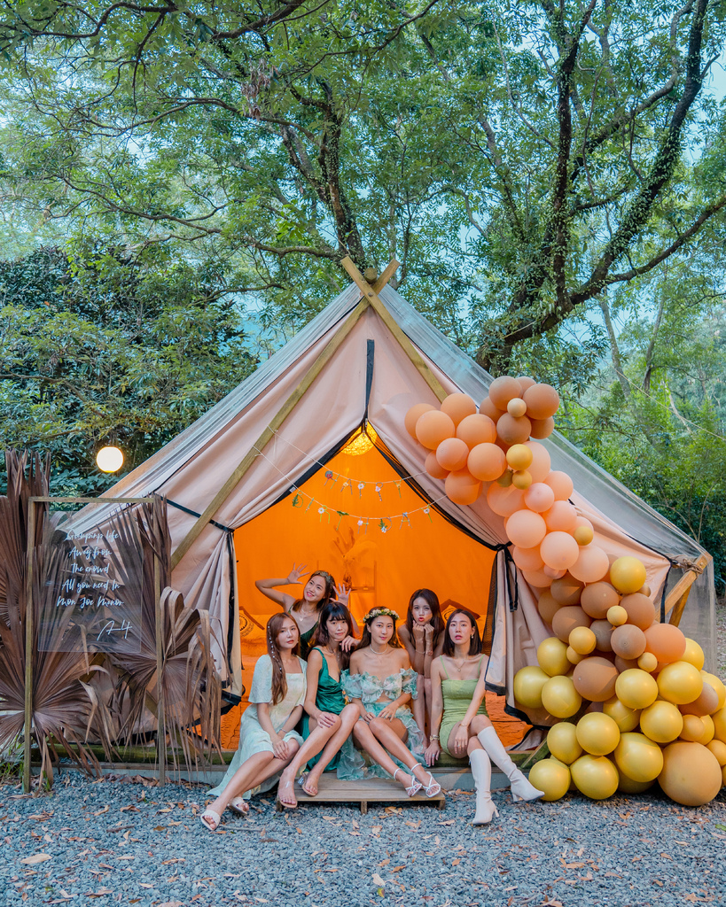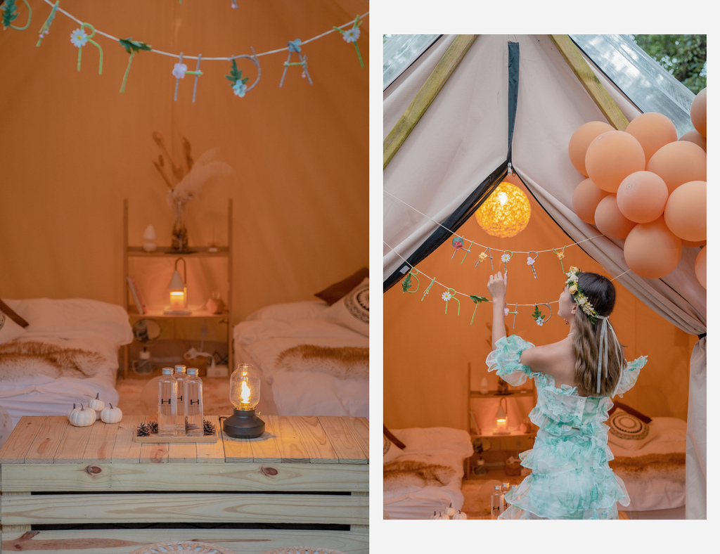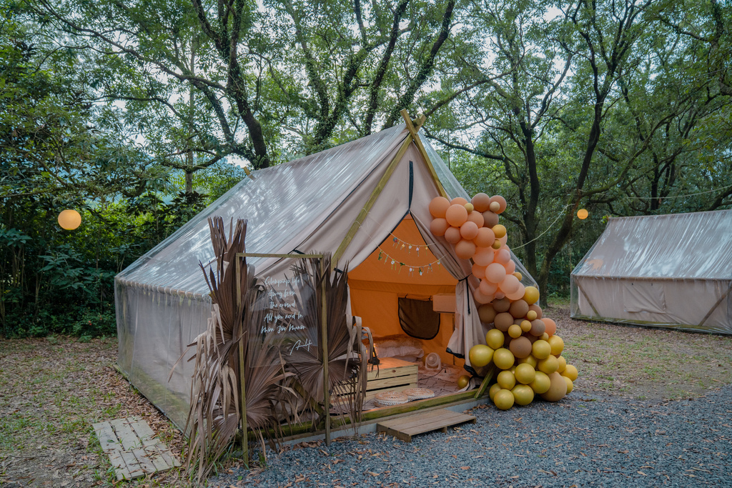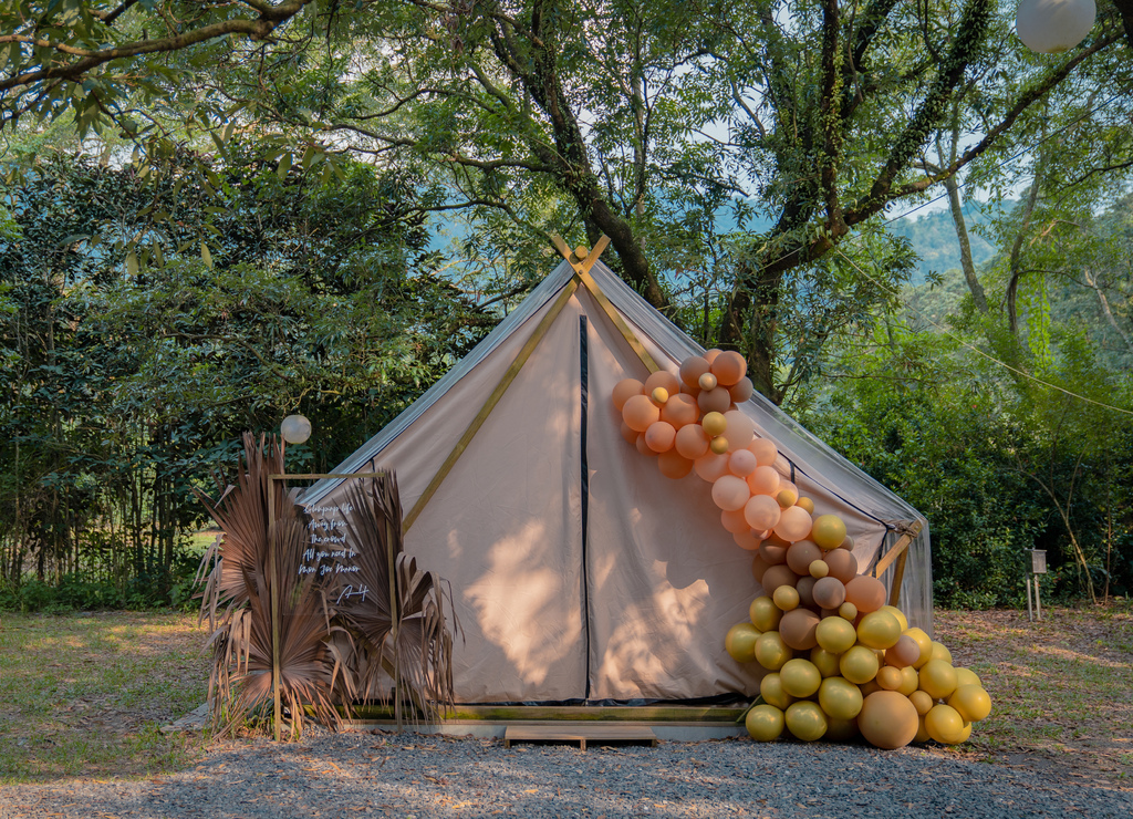 我們住的是 A3、A4 帳篷,網路上最多人分享的角度是 A4 帳篷,我個人也覺得角度拍起來最美,不過無法指定帳篷,可以私下偷偷私訊問✨。營區也有提供加購的氣球佈置服務,我覺得很方便不需要再另外找或是自己打氣,顏色也可以跟直接跟他們討論,check in 前氣球佈置就會準備好👍。
