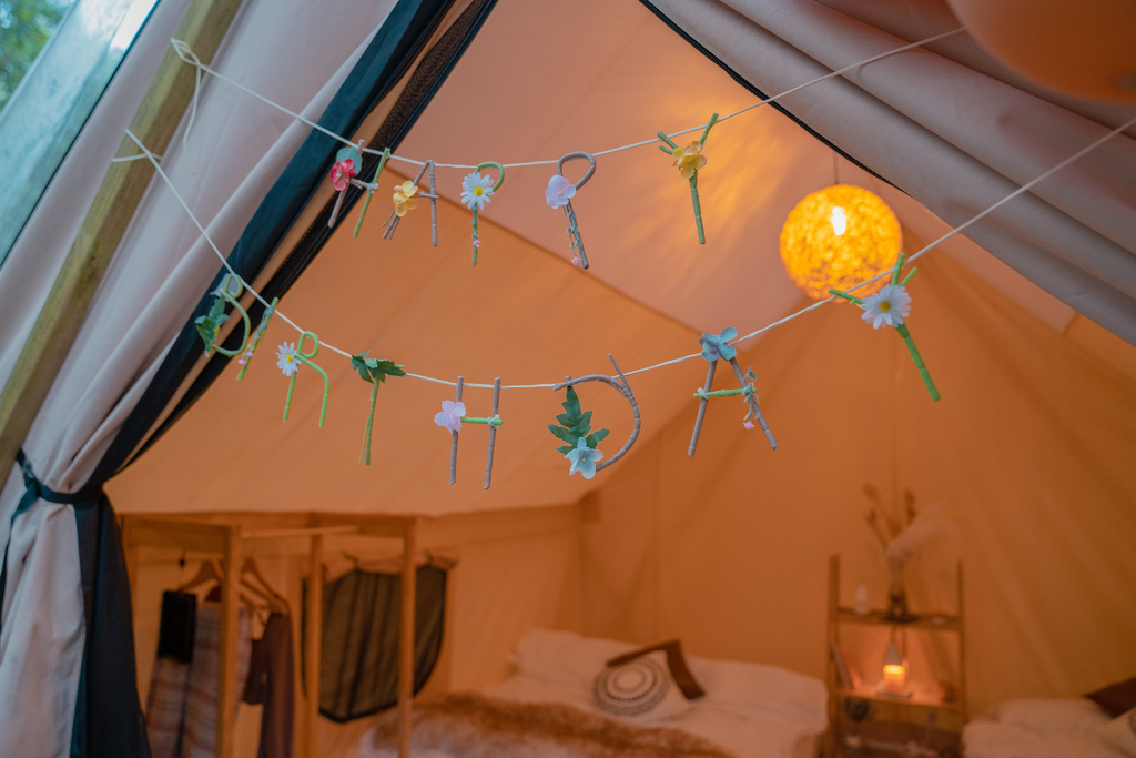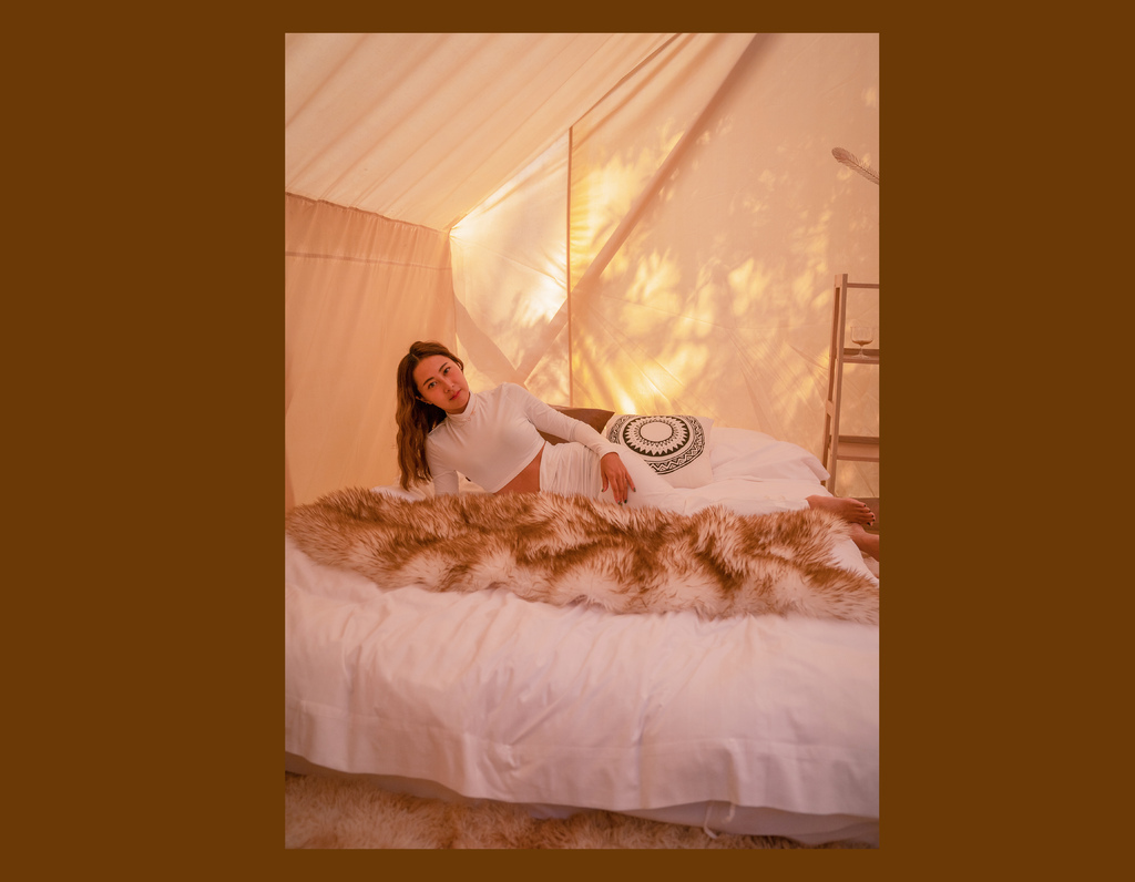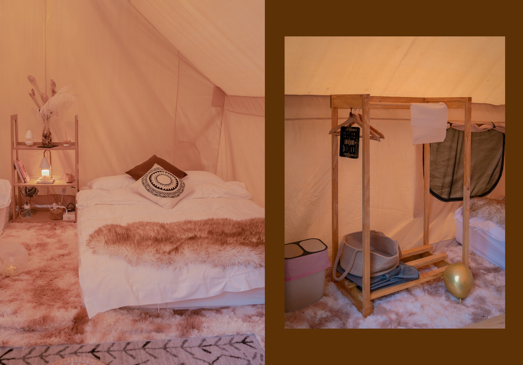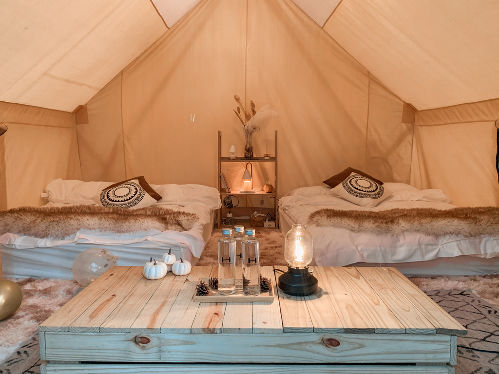 帳篷內部的擺設非常波希米亞風💕,木質家居、毛絨地毯大大小小的道具都很到位,
