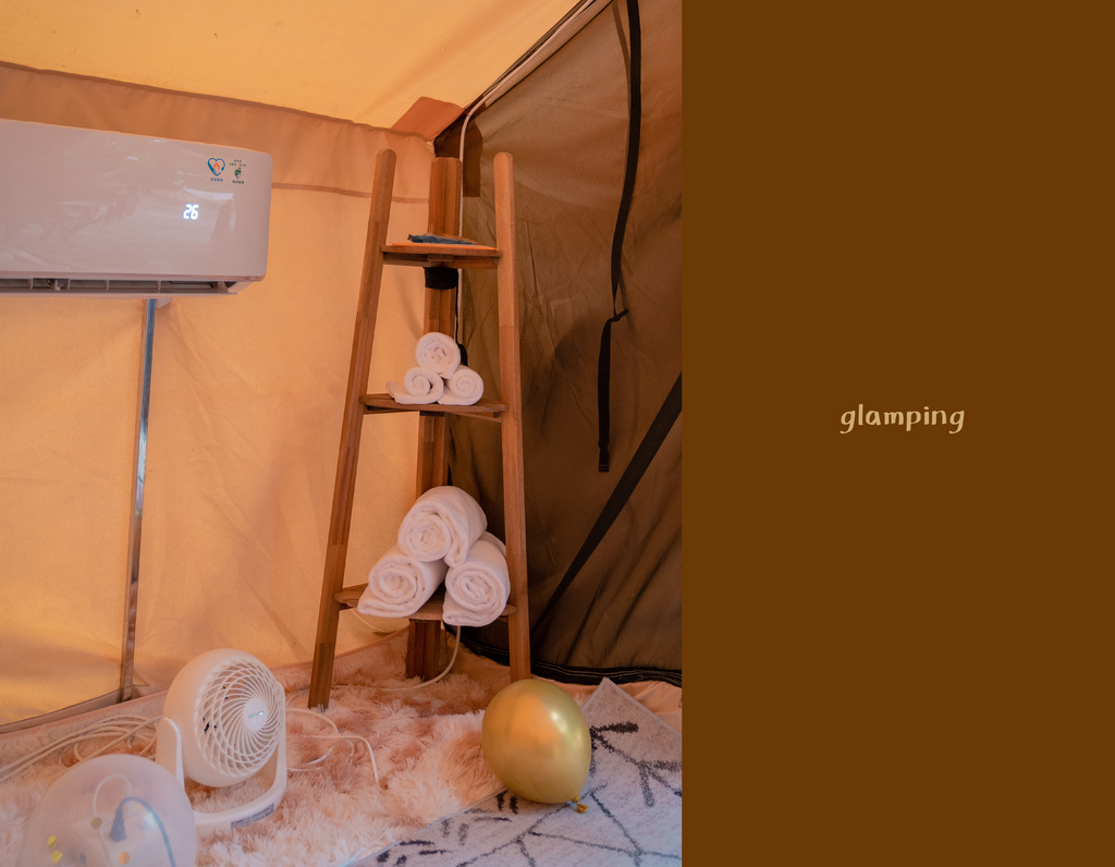 最讓人驚艷是冷氣竟然是分離式冷氣,住過好幾個懶人露營都是落地式冷氣,聲音大而且只有局部涼😂,分離式冷氣可以將溫度平均散到各處,夏天不用擔心會被熱醒!帳篷是我們住過最遮光的,完全可以一覺到天亮👍!