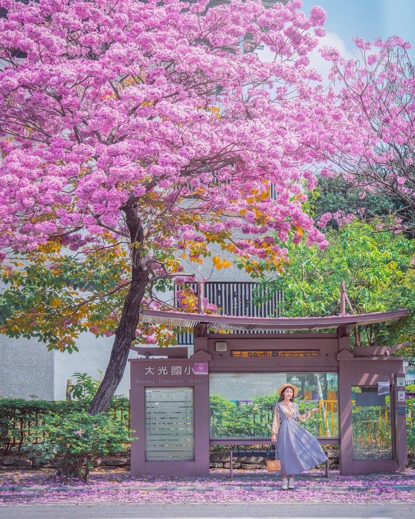洋紅風鈴木花期不長,大約1-2週就會開始凋謝,要把握盛開的時間✨。台南北區大光國小的公車候車站,是每年三月最美的一站❤️,兩邊種了兩株高大的洋紅風鈴木,粉紅又帶點紫色花瓣,滿開在樹梢,一陣風吹過花瓣落下,飄起粉紅雨超級浪漫💕,經過的路人或是特地來拍照的群眾,都會忍不住驚呼”哇~太美了~太美了~“。雖然不是偌大的景點,但我個人還是十分推薦,整個畫面乾淨又浪漫,能拍出唯美的日系照👍。