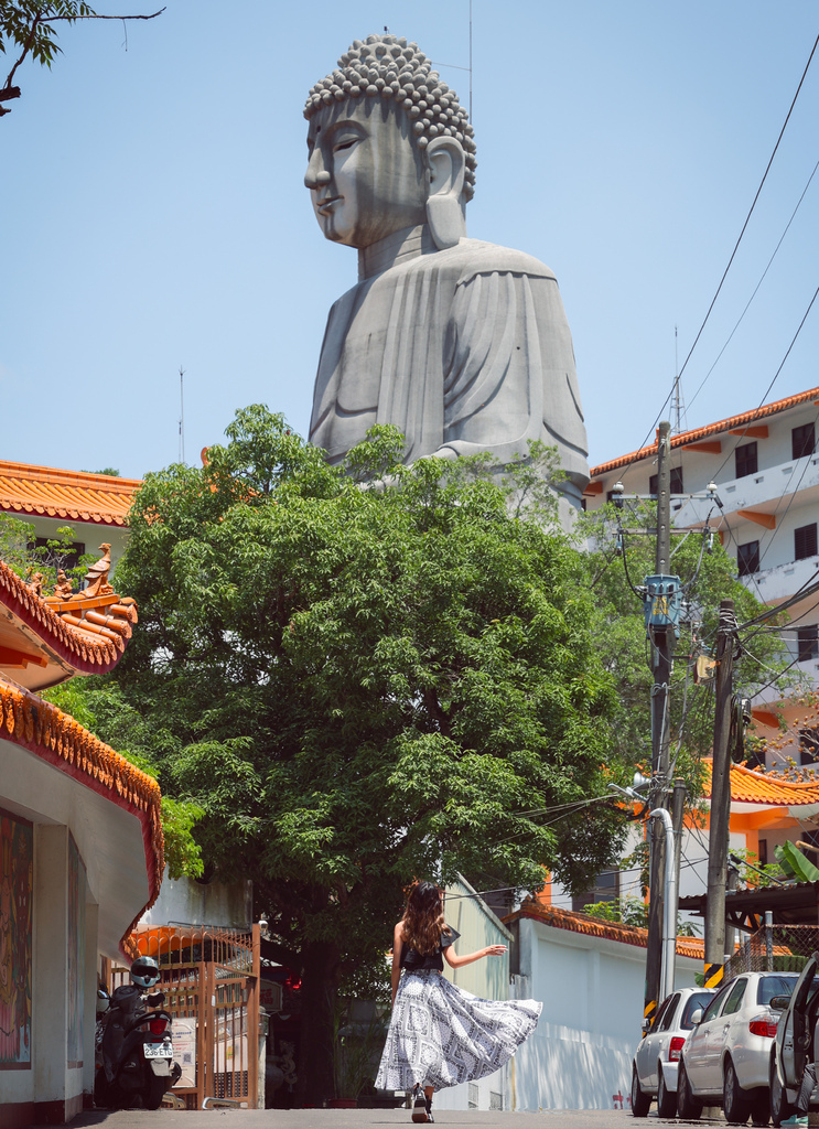 在國三往關廟休息區都可以看見的大佛,大佛位於台南的千佛山菩提寺,關廟群山之間的禪宗叢林道場,有著八丈四高的釋迦牟尼佛像,和全台灣第一座金剛經佛塔。園區環境不大,各個角度都能看到大佛坐於佛寺,非常莊嚴。