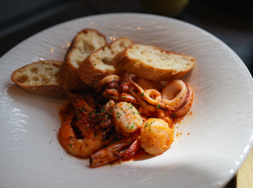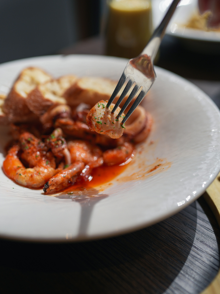 海鮮使用乾烙的作法,再用大量的蒜頭下去爆香,加入橄欖油後可以搭配法棍一起享用。