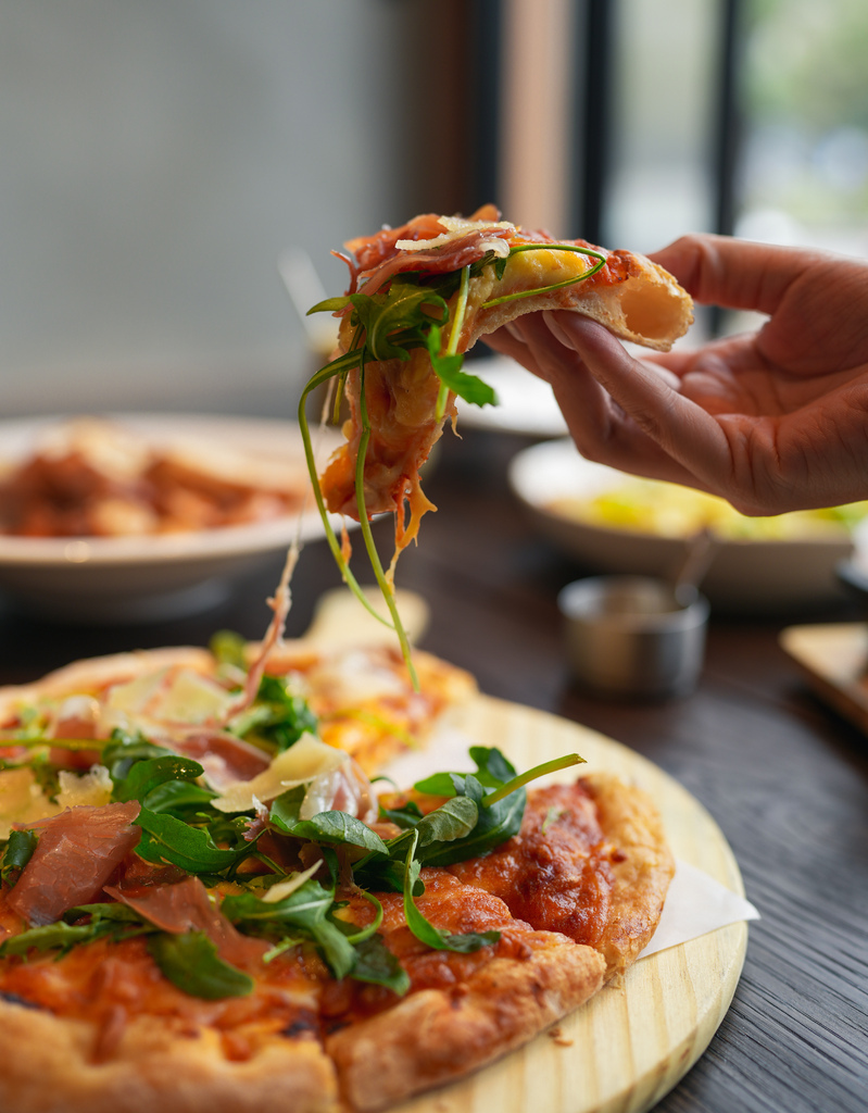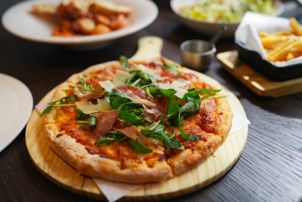帕瑪火腿披薩是非常道地的義式料理,濃厚的起司搭配西班牙帕瑪火腿、新鮮的芝麻葉再淋上香氣十足的松露油,餅皮酥脆,