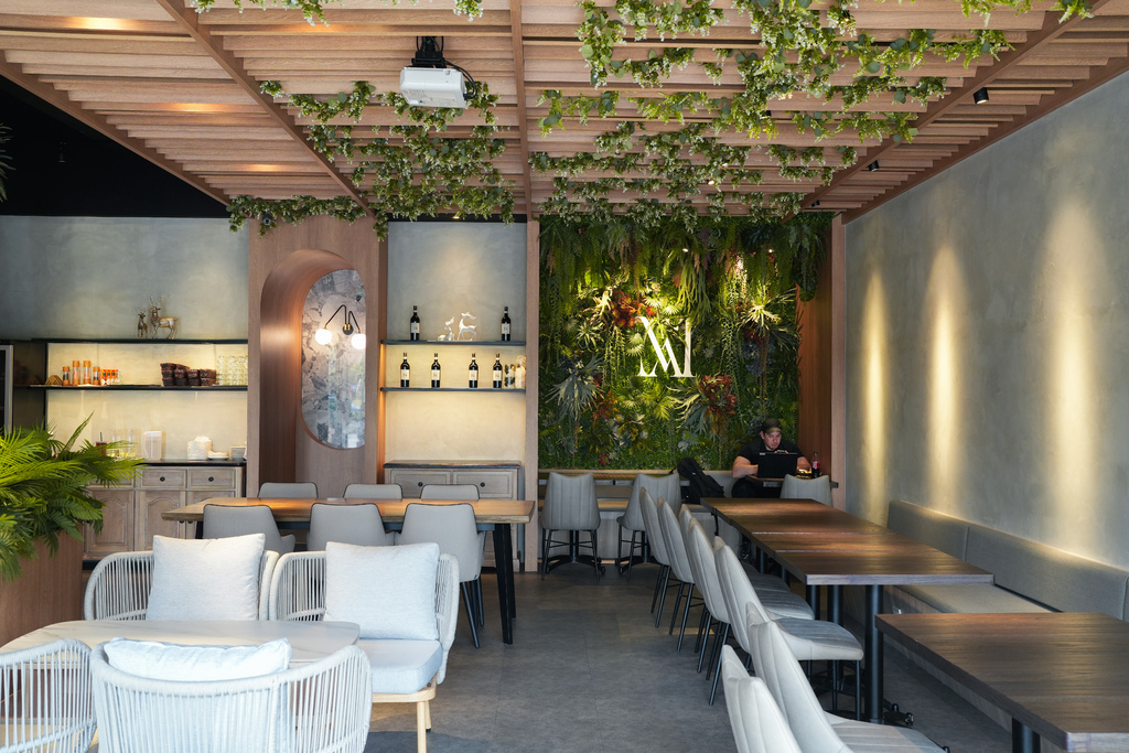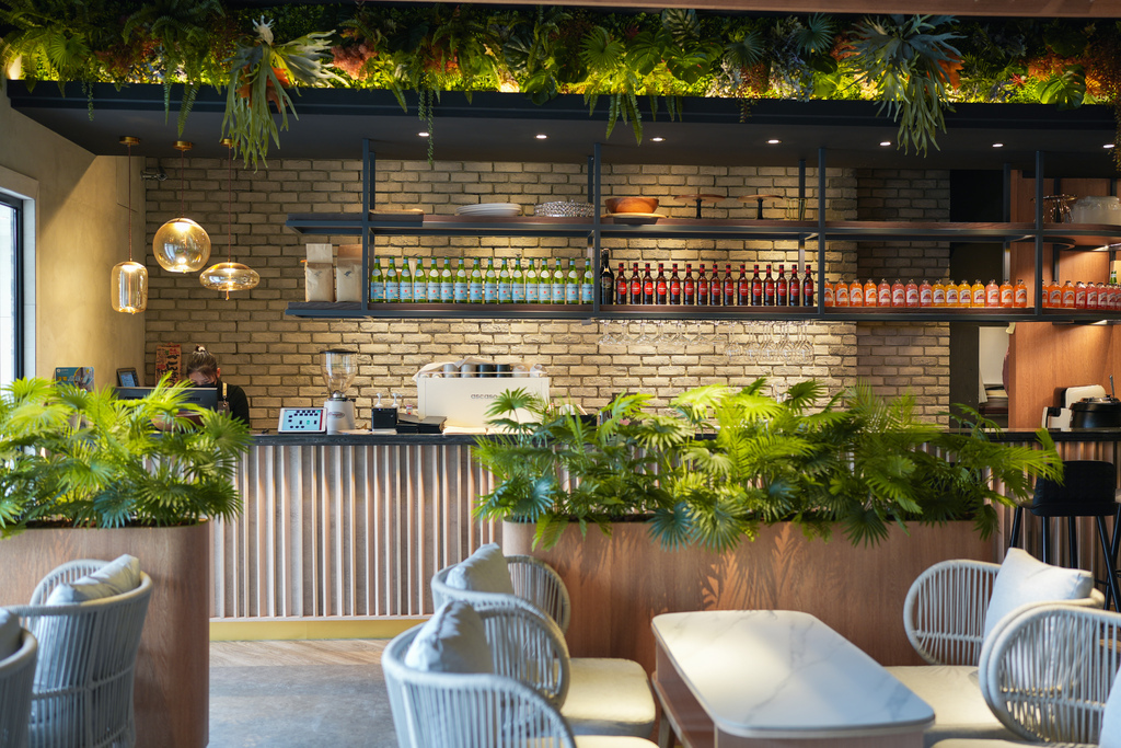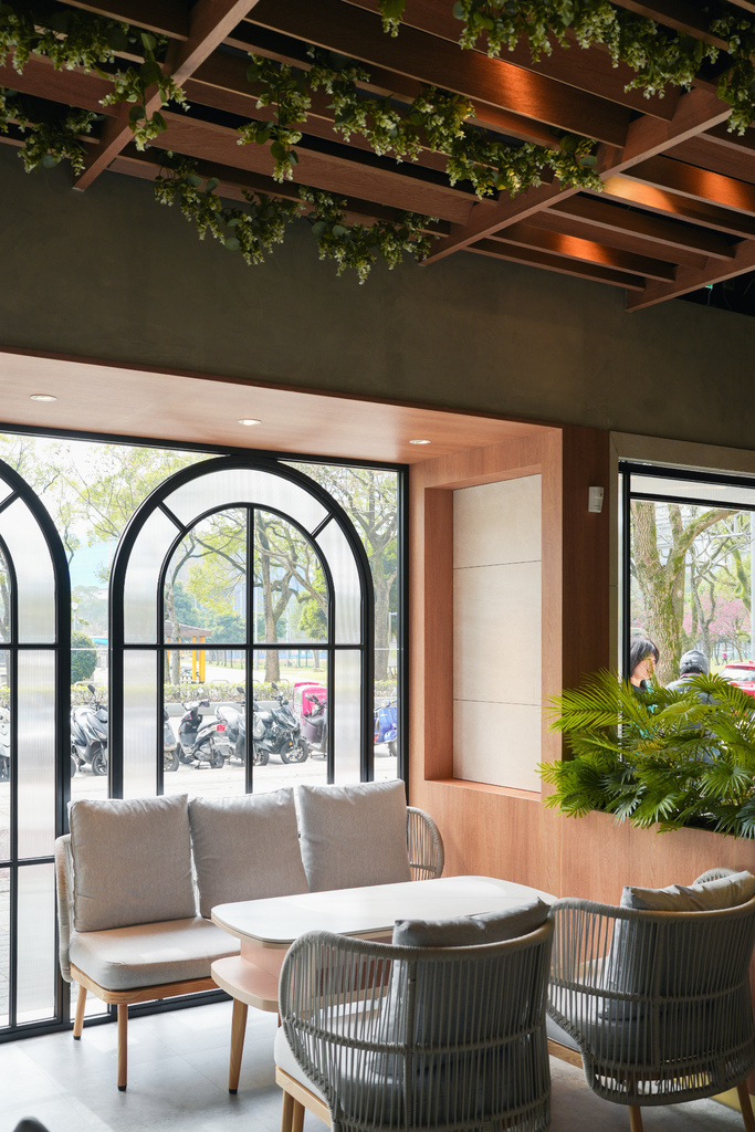 走進餐廳,首先會看到一個開放式的大吧台,圓弧設計、淺色木磚、格柵、綠色植物,天啊這個設計太美了!!