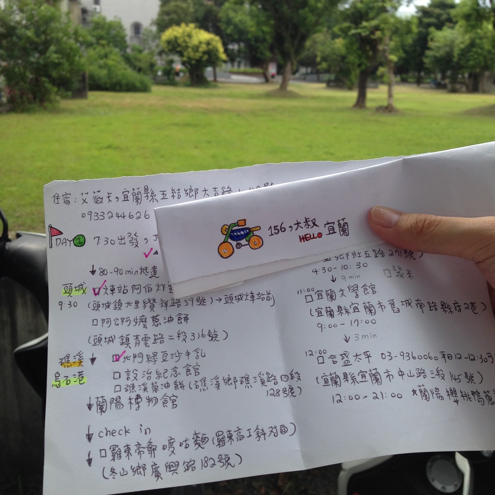 我與大七歲半的男友,計劃著騎車遊台灣,宜蘭是我們的首挑戰,去程我們走北宜公路(1.5hr),九彎十八拐,山路地形,有大樹遮蔭所以不熱。在宜蘭遇到回老家的朋友想直接載我們回家,經過討論還是拒絕了,原計畫,回程濱海+雙溪回家(合計3hr),濱海為海線,很美很美,很值得一試,看到雙溪的指標我們決定把路線切換為山線,一路回台北。