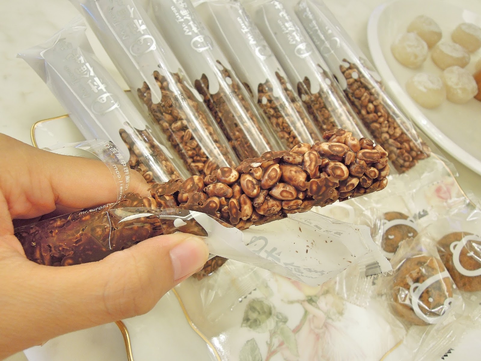 傳統的米食點心,加入黑白巧力、芝麻、堅果,中西合併的創意小點心,香脆可口,外觀也加入很有心思的設計,一口一口就能有氣質的吃完,改良後的包裝不再像傳統米食吃得滿桌都是了,下午茶搭配咖啡,perfect。